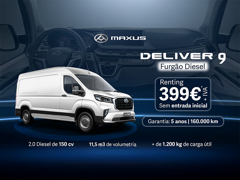 *Exemplo para Maxus Deliver 9 – L3H2 2.0D 6MT; exclui despesas de legalização, transporte e preparação, Sem Opções, em Aluguer Operacional de Viaturas a 72 meses e 90.000km. Exclusivo para clientes empresas e ENÍS. Aluguer mensal inclui IUC, IPO, Manutenção, nos termos do contrato de Renting, condicionado à aprovação da Santander Consumer Services SA. Não incluído: Seguro obrigatório. Condições válidas até 31 de Outubro de 2025.